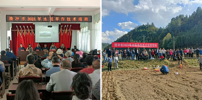 2023年3月23日,腾冲市2023年水稻旱作技能培训在曲石镇开班,来自来自市农业中心、各乡镇(街道)农业综合服务中心技术人员、村委会干部和水稻种植户大户共72人参加。yl8cc永利会员中心朱有勇院士水稻旱作技术团队参与培训。