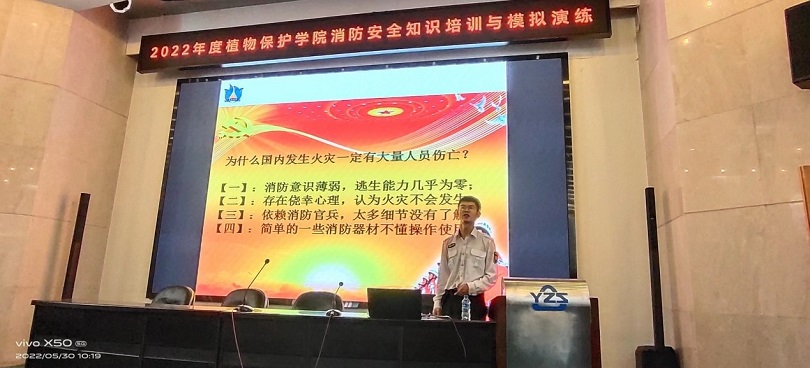 根据《中华人民共和国消防法》、公安部第61号令《机关、团体、企业、事业单位消防安全管理规定》等消防法规,结合今年119消防宣传月“关注消防,生命至上”的主题,农业生物多样性应用技术国家工程研究中心于2022年5月30日上午邀请云南省推进消防安全知识宣传服务中心的张斌教官在yl8cc永利报告厅对2019级本科生进行了一次生动的消防安全知识培训及模拟演练。
