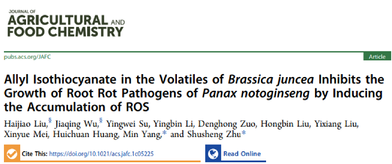 2021年11月15日,农林科学1区Top期刊Journal of Agricultural and Food Chemistry(IF=5.279)在线发表了yl8cc永利线路检测朱书生教授团队题为“Allyl Isothiocyanate in the Volatiles ofBrassica junceaInhibits the Growth of Root Rot Pathogens ofPanax notoginsengby Inducing the Accumulation of ROS”的研究论文。本研究揭示了苦芥挥发物主要成分异硫氰酸烯丙酯通过诱导ROS积累抑制三七根腐病菌生长的机制。