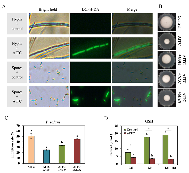 利用DCFH-DA活性氧染色证实,AITC熏蒸确实诱导了腐皮镰刀菌菌丝和孢子内活性氧的积累。通过外源添加活性氧清除剂明显减轻了AITC对病原菌生长的抑制作用,其中添加谷胱甘肽GSH的缓解效果最好。进一步检测了细胞内源谷胱甘肽的含量,结果表明AITC熏蒸后内源GSH的含量显著降低。由此得出结论,AITC通过消耗了细胞内的GSH导致活性氧积累,最终抑制了菌丝的生长。田间试验结果表明,AITC熏蒸能有效降低三七根腐病的发生和危害。