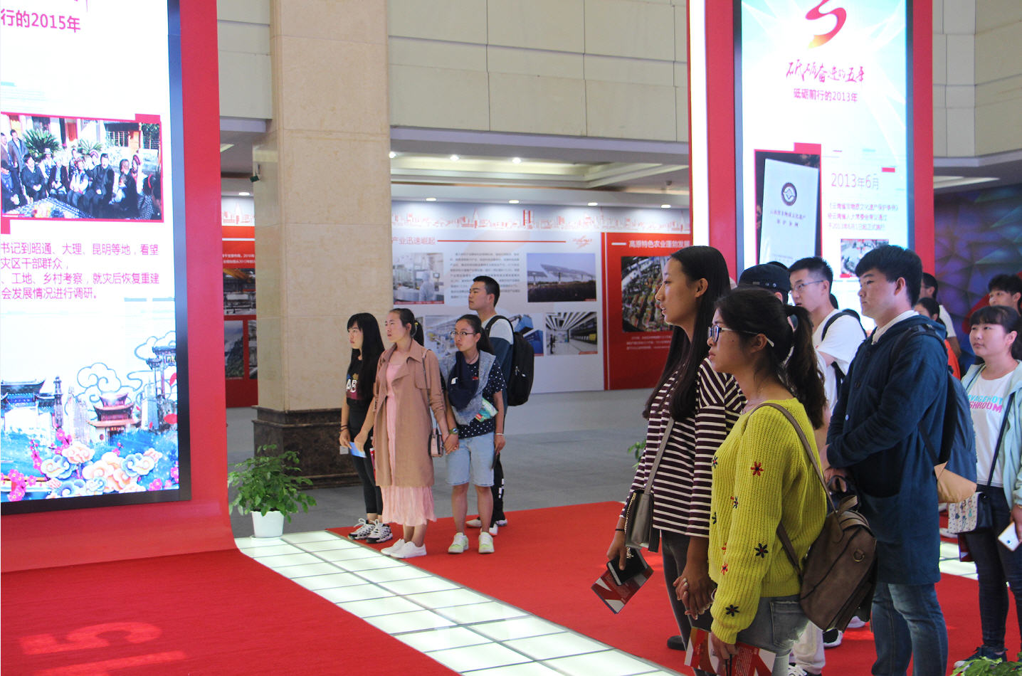 现场展馆布局以学习贯彻习近平总书记系列重要讲话精神和治国理政新理念新思想新战略以及考察云南重要讲话精神为主线,通过“闯出一条跨越式发展的路子”“民族团结进步示范区”“生态文明建设排头兵” “面向南亚东南亚辐射中心”“不忘初心 继续前进”五大板块的展出,全景式全方位多角度展示了党的十八大以来,省委、省政府在以习近平同志为核心的党中央坚强领导下,团结带领全省各族人民攻坚克难、矢志奋斗,全省经济社会各项事业发展取得的辉煌成就。展出内容突显五年来,各族干部群众,在省委、省政府团结带领下,统筹推进“五位一体”总体布局,协调推进“四个全面”战略布局,坚持以新理念引领经济发展新常态,坚持发展为第一要务和全面从严治党主体责任两手抓、两手都要硬,全省经济社会和党的建设各项工作都取得了新成效、发生了新变化,在决战脱贫攻坚、推动跨越发展,全面建成小康社会的道路上迈出了坚实的步伐。