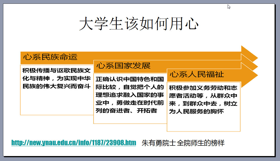 同时会议还以学院全国优秀共产党员——朱有勇院士服务澜沧脱贫新闻报道视频学习,号召广老员工和员工干部学习朱院士一心一意为民服务的情怀和坚定的党性修养。心系人民福祉、解决生产中的重要科学和技术问题,是其不懈的精神动力和事业不断成功的思想保障。朱院士是全院学习的好榜样,也是“修德博学,敬业创新”学院院训的最好诠释,是加强社会主义核心价值观,注重思想引领,培养创新创业一流人才的最好案例,全体员工干部和各班、团和党支部需要以身边鲜活的案例学习中进一步体会全国高校思想政治工作会议精神。