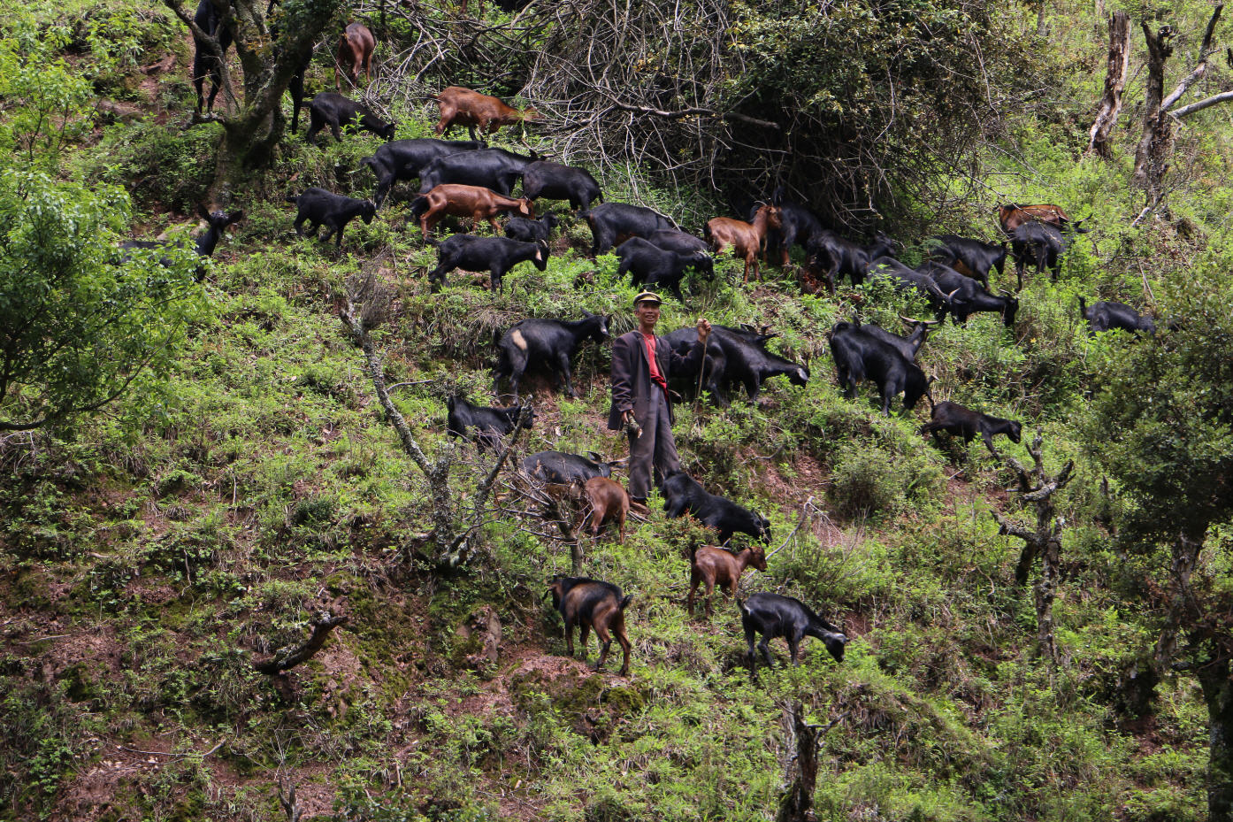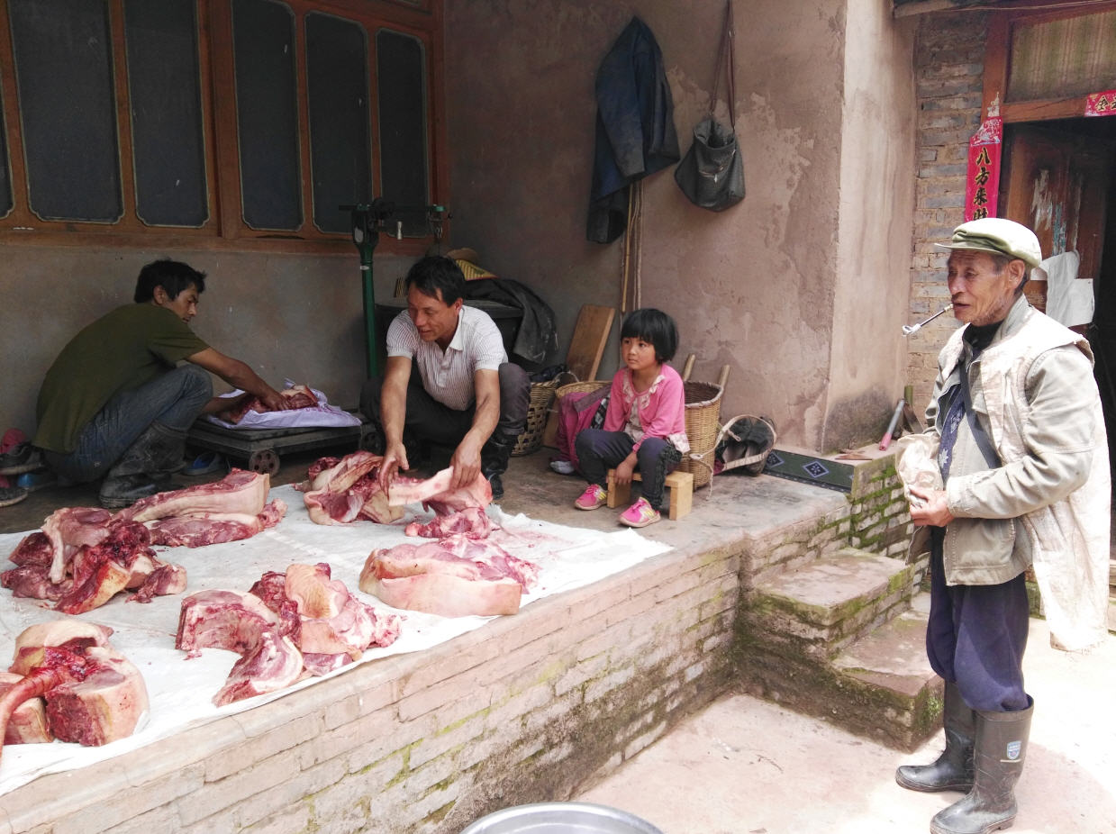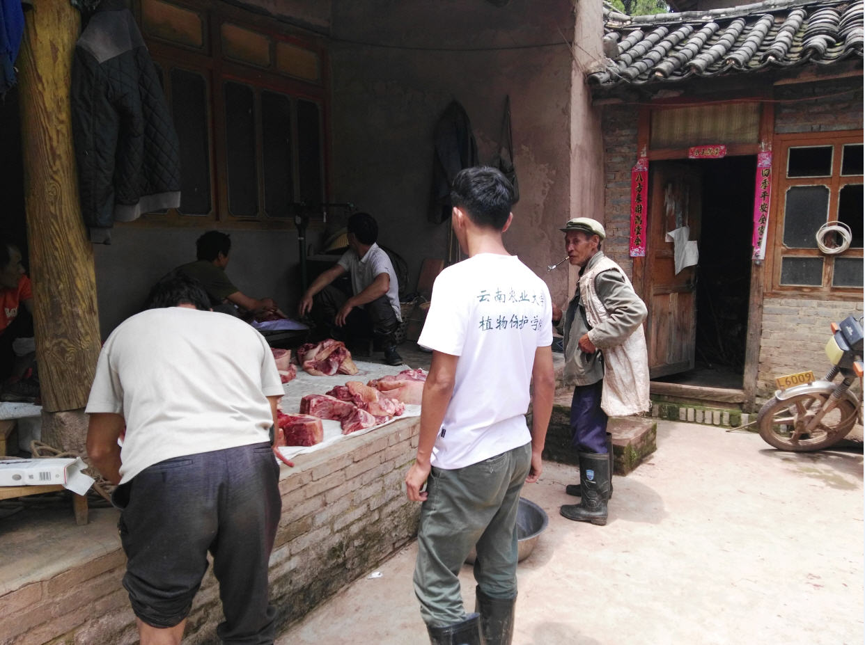为迎接即将到来的彝族火把节,石碓窝村杀猪宰羊按户均分的场景
