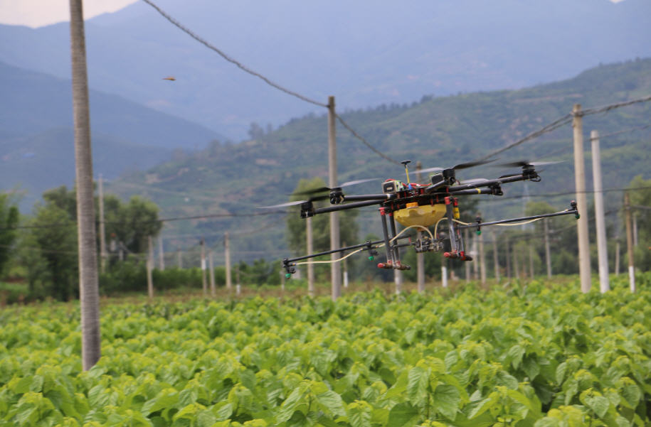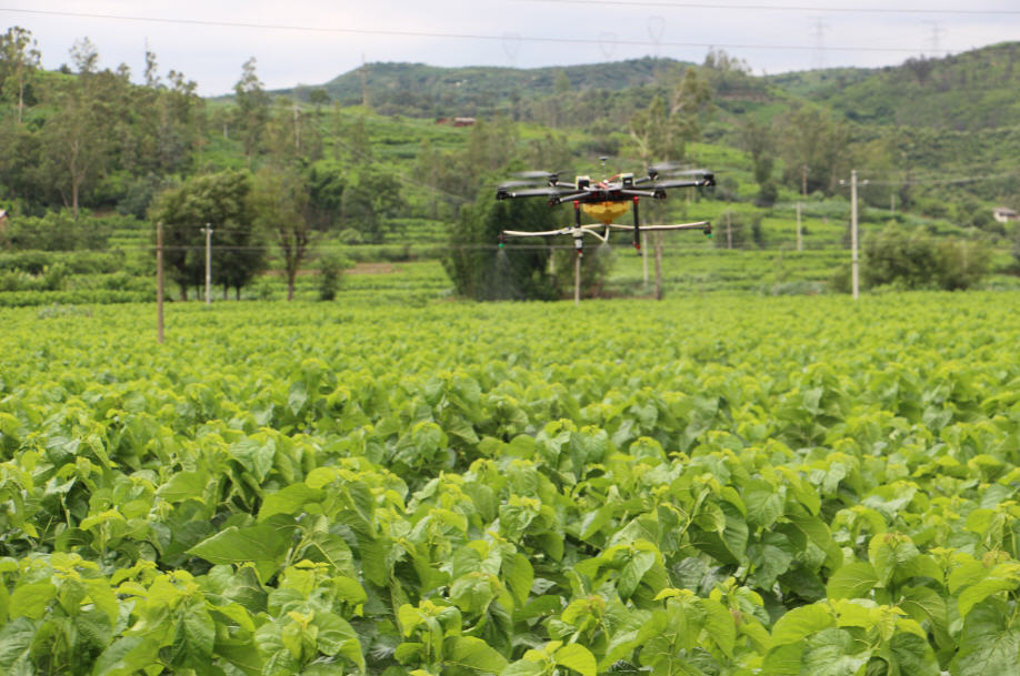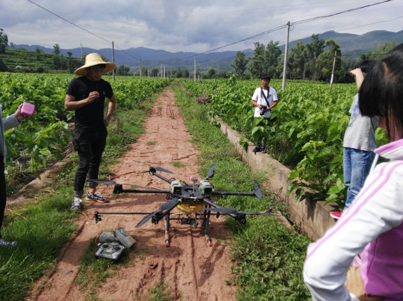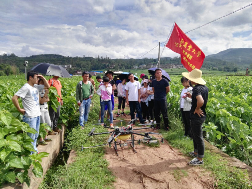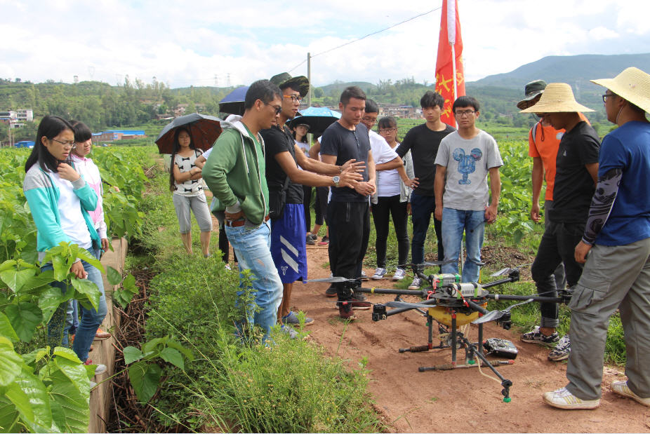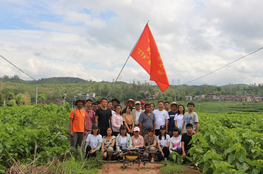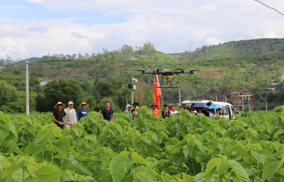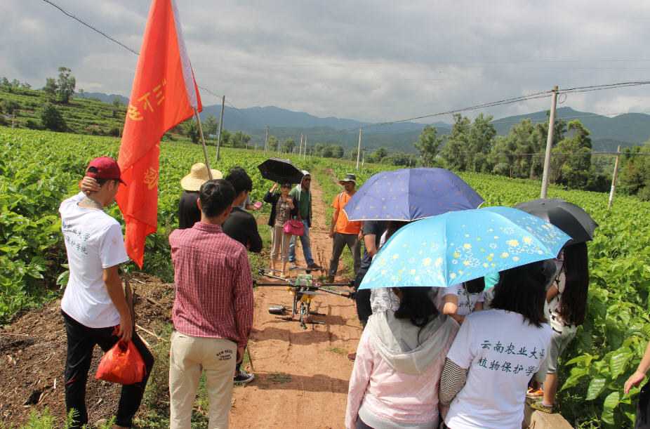 云南绿飞公司与学院技术支撑合作开发的植保无人机及其一站式服务模式在全省水稻、马铃薯、花卉、甘蔗、蚕桑等广泛应用并被普遍接受,成为当前我省农业有害生物统防统治的重要手段。志愿服务团队到大姚县蚕桑基地现场观摩该项技术在当地蚕桑病虫害的统防情况。同时,团队开展现场蚕桑有害生物诊断与无人机飞防作业药效抽样评价,并听取当地农户、干部和县级技术服务及操作人员对该项技术的评价反馈。基层干部群众对该项技术快速、高效、安全、节水、省工等特点给予高度称赞。同学们为公司在该领域为全省现代农业发展做出的贡献感到自豪