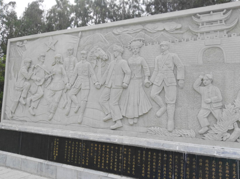 瞻仰当地革命烈士纪念碑和当地少数民族地区解放历史与军民融合浮雕,铭记先烈,民族团结、军民融合的重要性