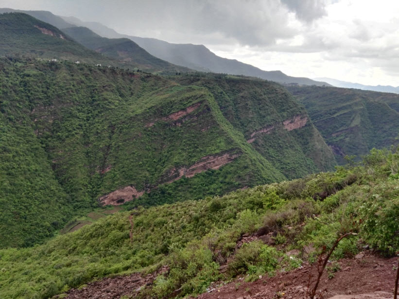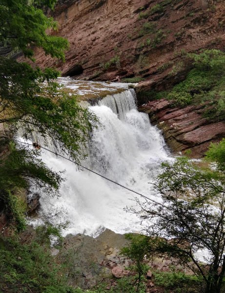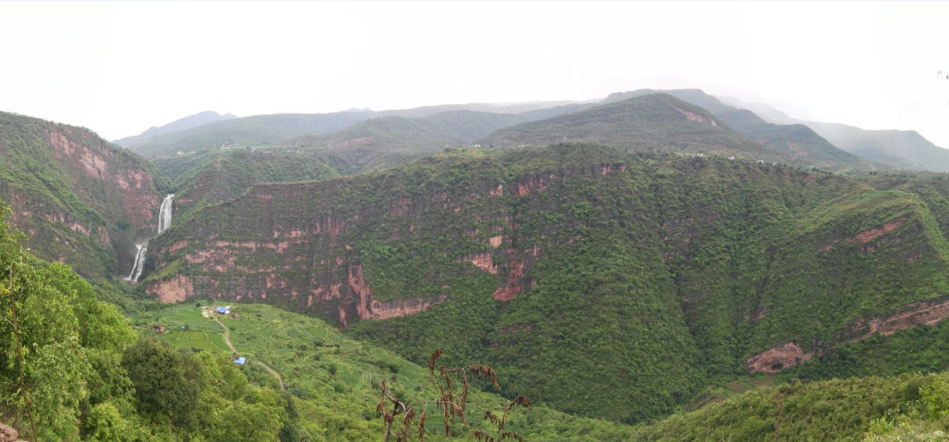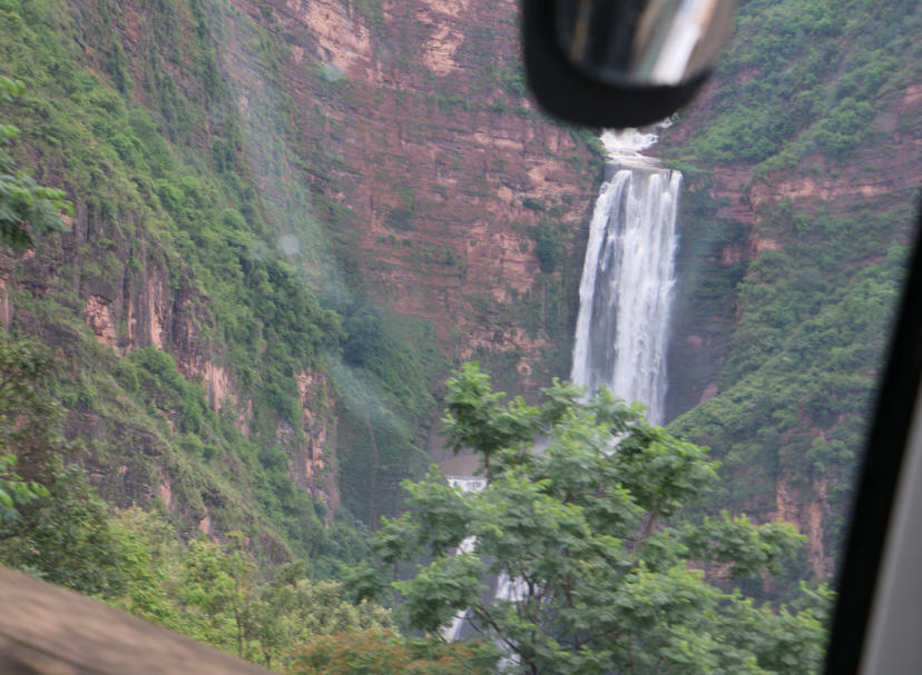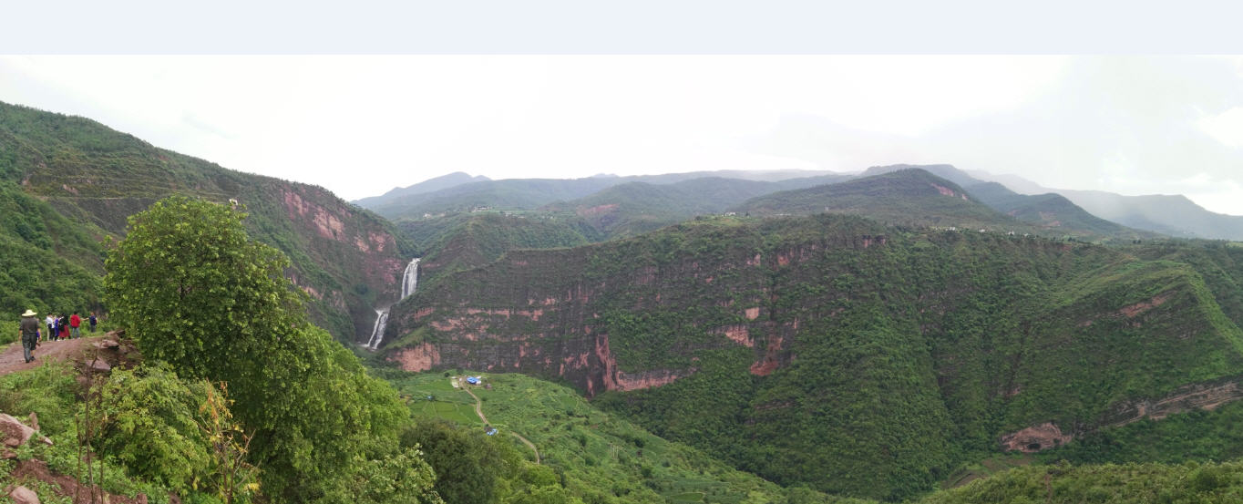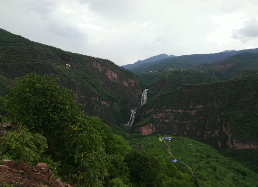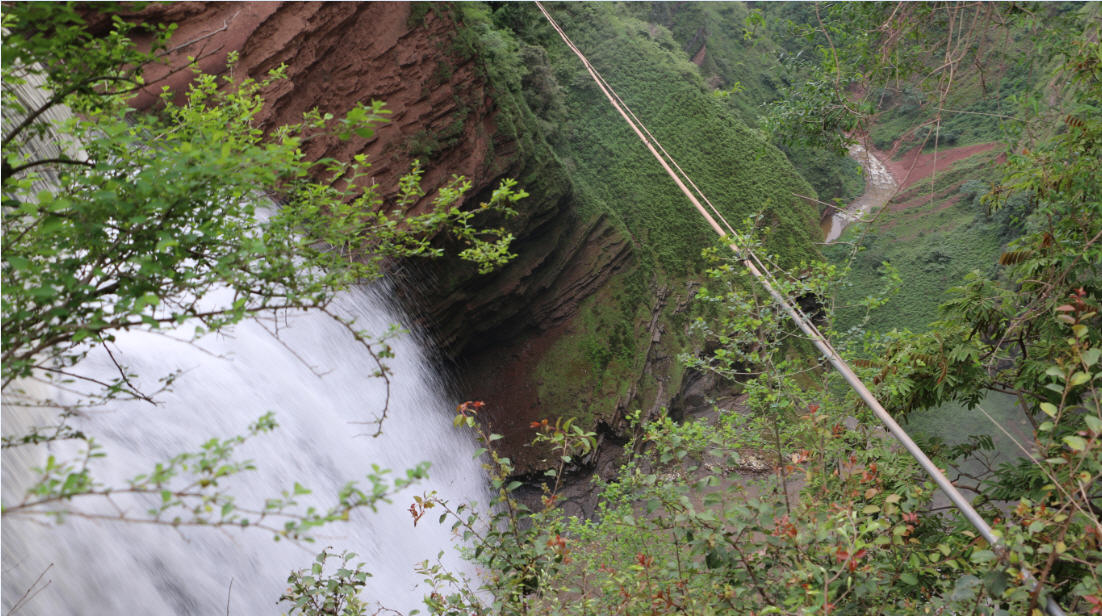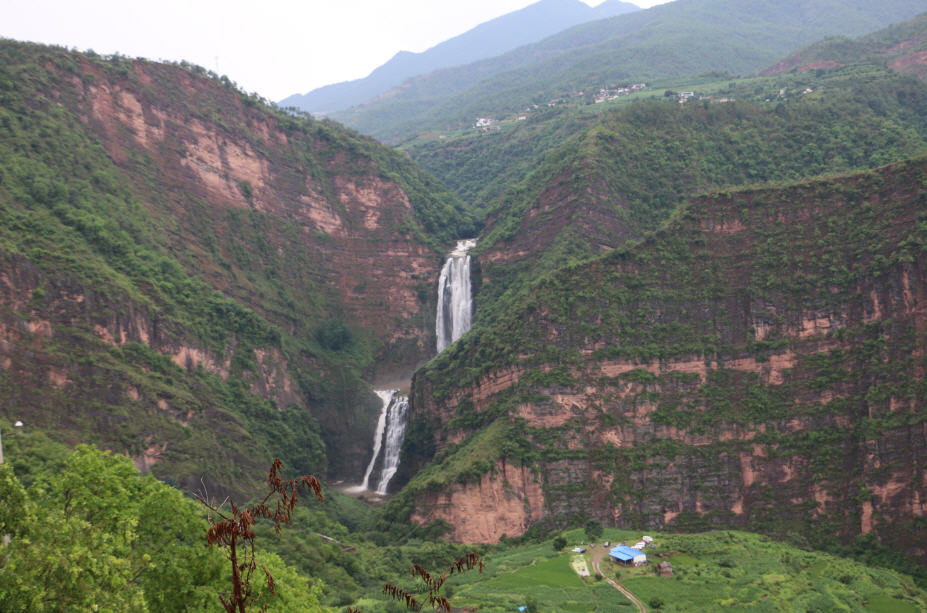 新街乡彝族村寨附近,车沿国道穿过一个隧道,眼前震撼的地质地理风貌和美妙的景色出现在眼前。近百米落差的瀑布从山涧飘落。
