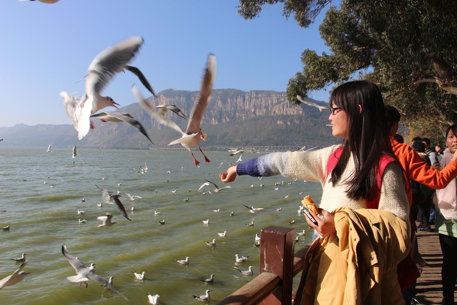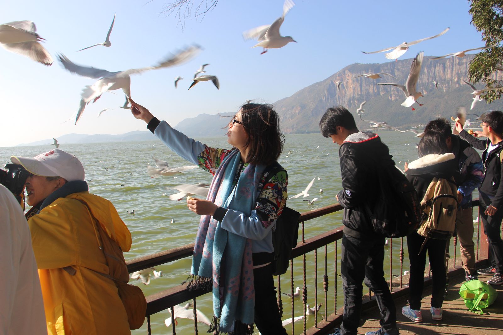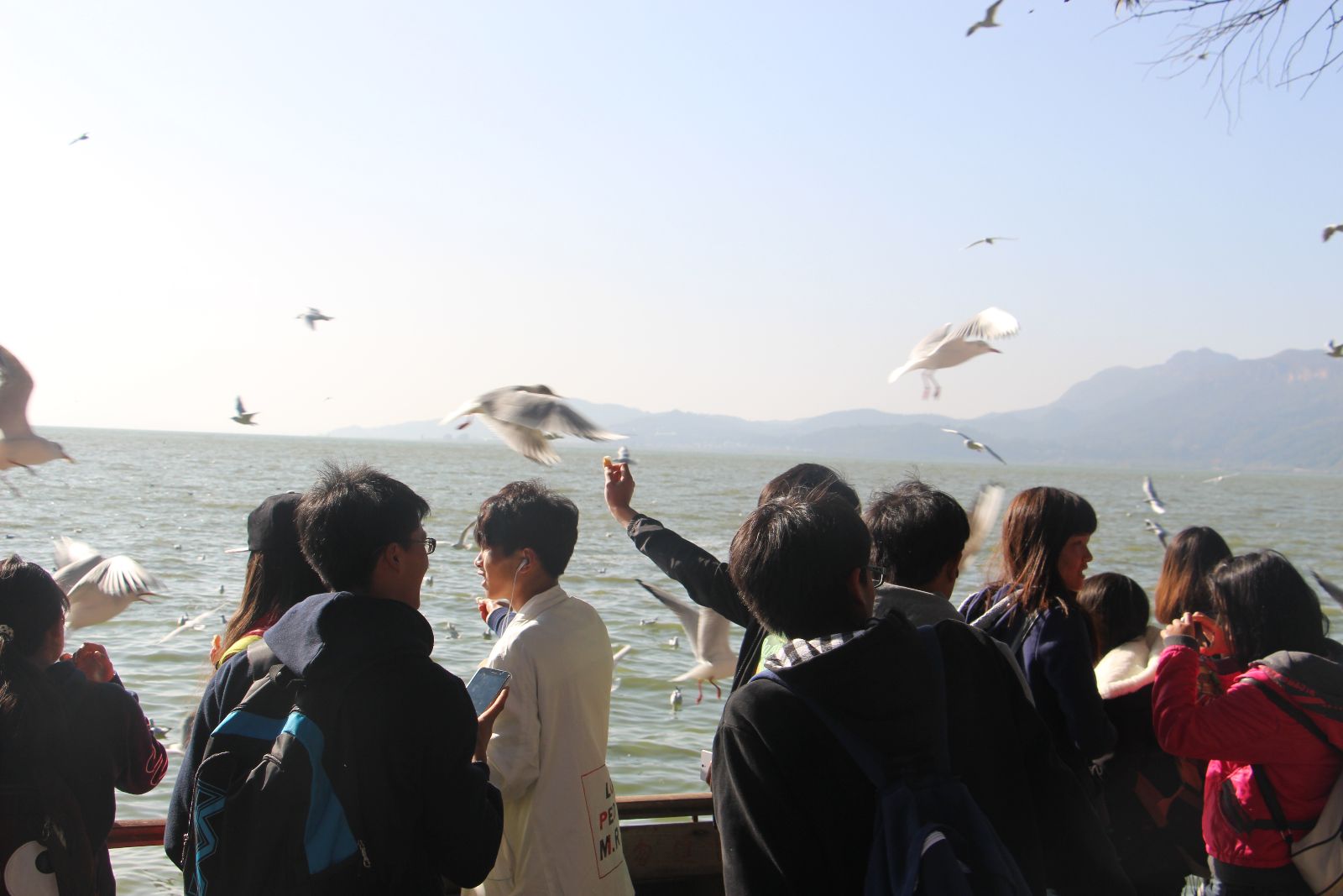 活动首先由爱心满满的护鸥开始。波澜不惊的滇池是大自然的恩赐,但飞翔于上空的海鸥们,展示的却是冬日少有的速度与激情。它们时而滑翔去吃人们手里的面包,时而静止在湖面等着人们来喂食,静谧的滇池变成了欢乐海洋,同学们火热的青春伴随着欢笑与尖叫在这个寒冷的冬天里恣意飞扬!下午两点多,当太阳的光辉为西山罩上了一层金边,