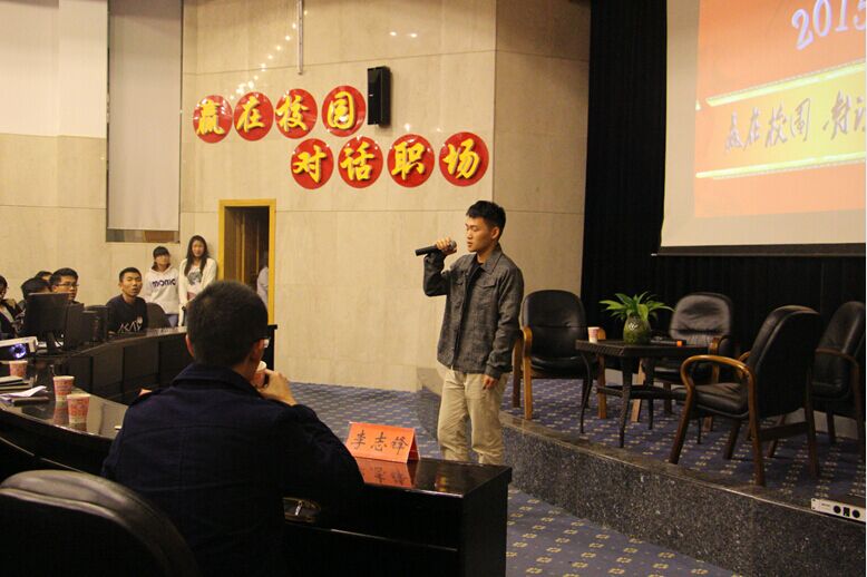 访谈一开始,一首《马云一声笑》拉开了帷幕。三位领导就关于老员工的创业问题先后发言,话语幽默,赢得在场同学们的阵阵掌声,整个大厅都充满了欢声笑语。期间还由yl8cc永利13级植保专业的郭海业同学带来《蜗牛》一曲,激励着同学们像蜗牛一样,不抛弃,不放弃,为了梦想勇往直前。