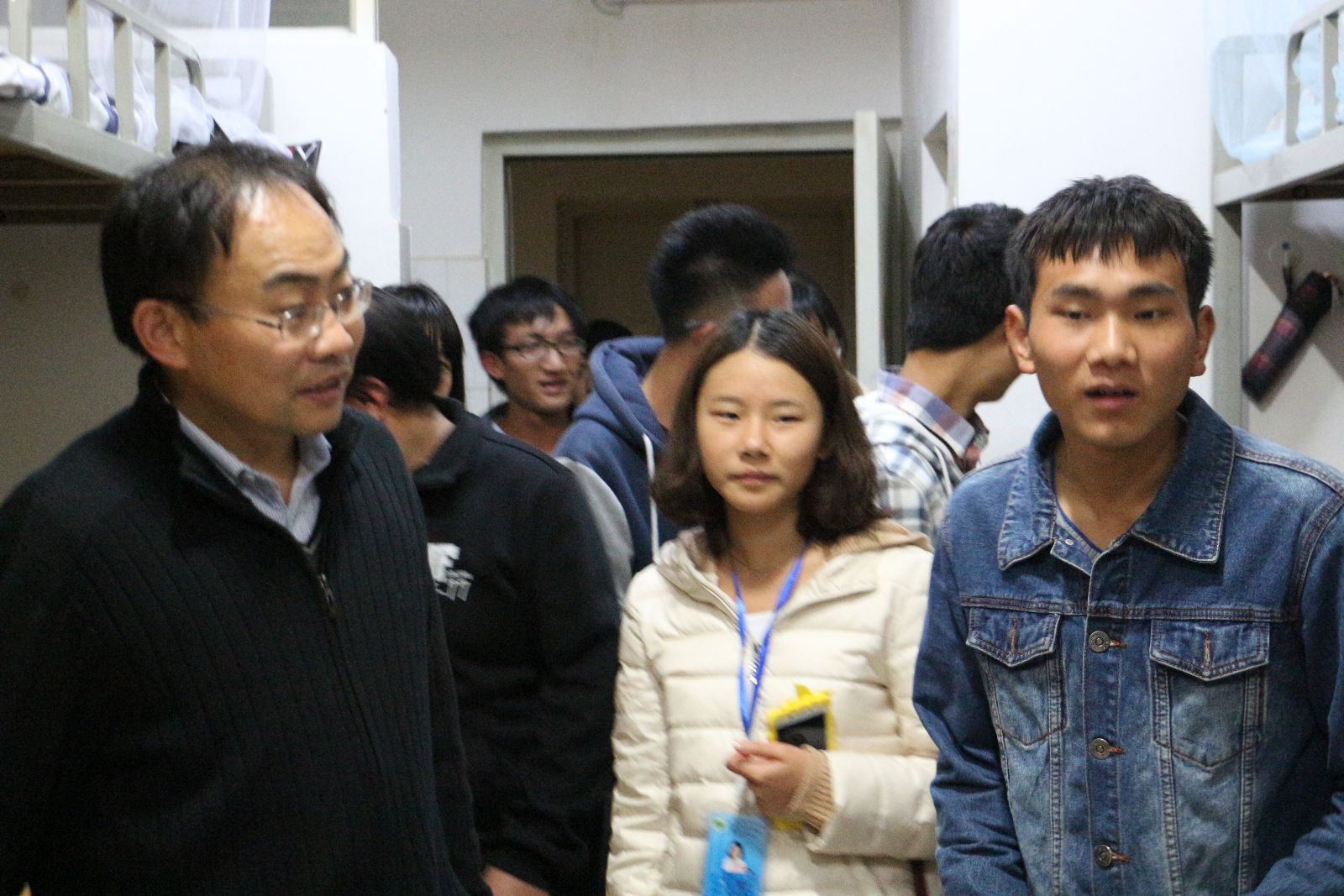 陈老师一行人首先来到了16幢女生宿舍,在宿舍里,陈老师认真询问了同学们是否使用违规电器,叮嘱她们要注意宿舍安全问题,陈老师亲切地询问了同学们毕业后的目标,也鼓励她们定下学习的目标并好好努力。随后陈老师他们又走访了15幢男生宿舍,陈老师重申了在宿舍里不准使用违规电器的问题,还询问了同学们目前的学习状态与对于专业知识方面的困惑,与同学们分享了学习经验与生活体验,氛围欢乐融洽。在本次走访宿舍中,有些宿舍收拾得温馨整洁,而有些宿舍却有些脏乱不尽人意,陈老师对好的宿舍进行了表扬,鼓励他们继续坚持,对于不好的宿舍,陈老师进行了批评,希望他们下次改进。