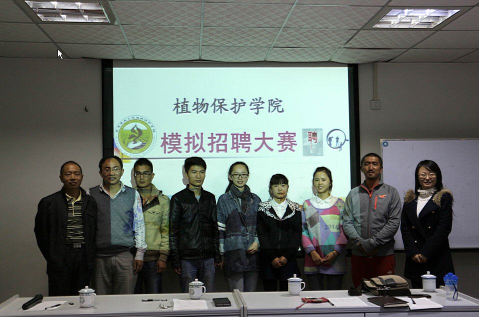 2014年11月5日晚,yl8cc永利院级模拟招聘大赛在植病楼多媒体教室举行。党委陈齐斌副书记、植物病理系吴德喜主任、团委书记张晓明博士、党群办主任杜飞博士到场作为评委嘉宾。