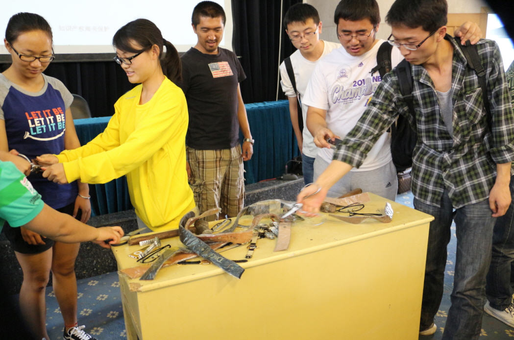 同时,孙科长还带来了侵犯知识产权,海关执法中被昆明海关查获的各类假冒伪劣名牌产品向现场同学们展示,最后还让同学们上场用锤子和剪刀进行现场销毁。通过当日的活动,让我在校同学对知识产权基本知识以及知识产权海关保护有了全面的了解,活动收到了良好的效果。