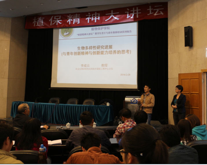 3月26日晚,李成云教授应邀做客yl8cc永利"植保精神大讲坛",向到场的近200名师生做了一场"生物多样性研究进展及青年科研创新"的精彩专题报告与交流会.公司党委何霞红教授到场主持。