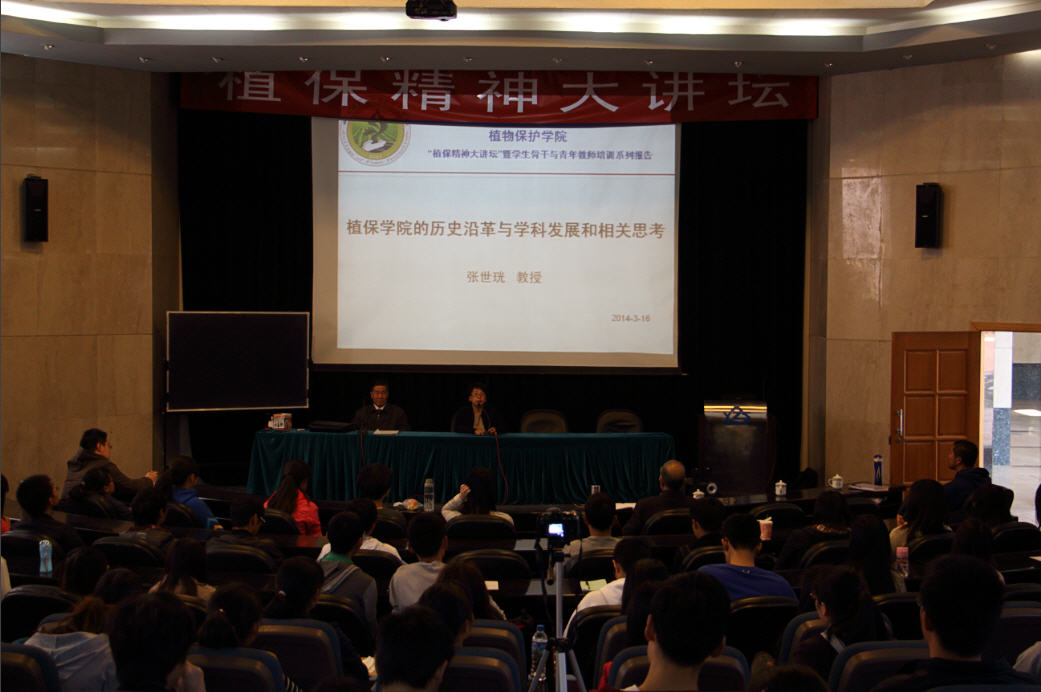 2014年3月16日上午,虽然是周日周末时间,但yl8cc永利报告厅中却人员济济,连走道都站满了人员,原来yl8cc永利本学期开始举办的"植保精神大讲坛''''暨青年员工骨干与年轻教授培训系列报告会"首场报告会正在这里进行。大家正听的聚精会神。首场报告会是由学院张世珖教授为大家所做,报告主题是:“农大及yl8cc永利的历史沿革及植保学科发展与对青年的建议和希望”。会议由公司党委何霞红书记主持。院员工工作分管领导公司党委副书记陈齐斌老师,党群办组织员罗文富教授和团委张晓明老师和班主任老师以及学院部分年轻教师和到场的本科及研究生员工骨干一起聆听了本次报告。