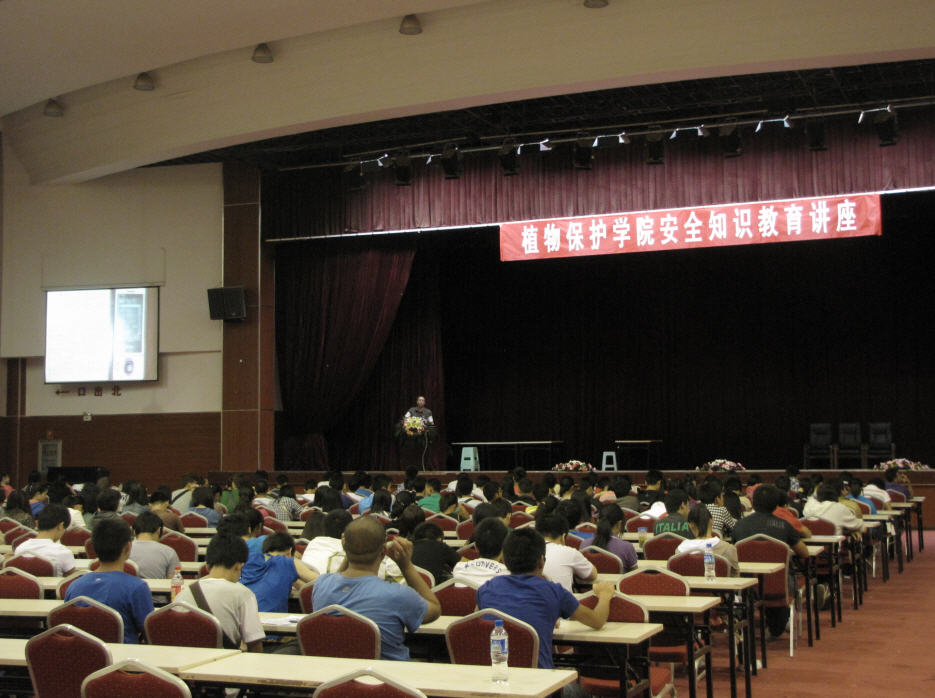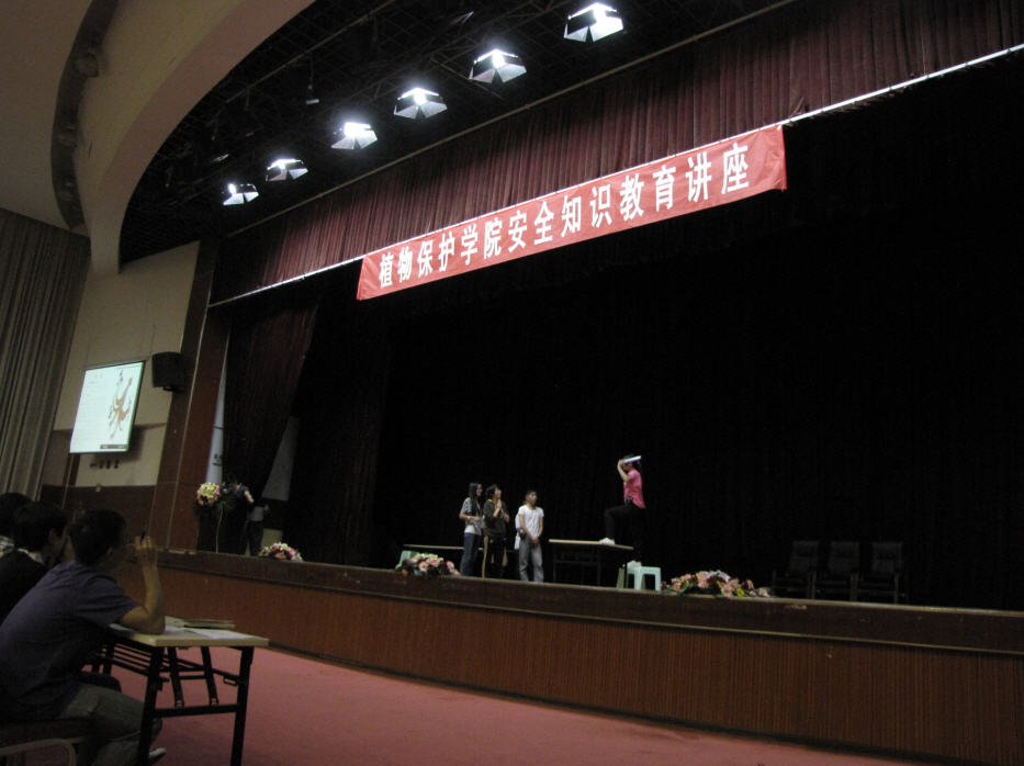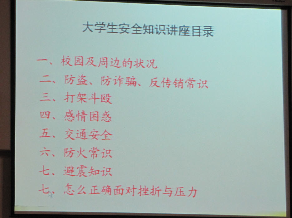 熊副处长通过多年校园安全保卫的工作经历和许多典型事例,再结合志愿者逼真而艺术化的同步情景剧再现,从校园周边环境、校园防盗、防骗、人际相处和人生安全、交通、火灾、地震、雷电等多方面进行校园安全知识系统全面的介绍,两个多小时实用的安全知识的讲座和志愿者情景表演情景再现,同学们听得津津有味。