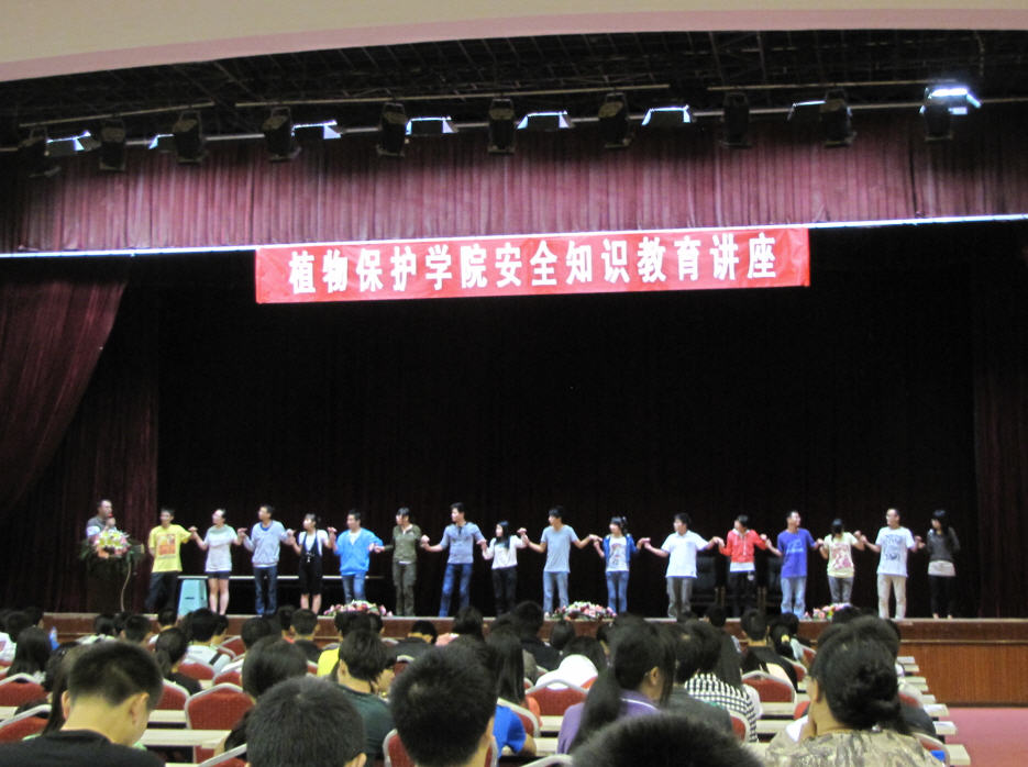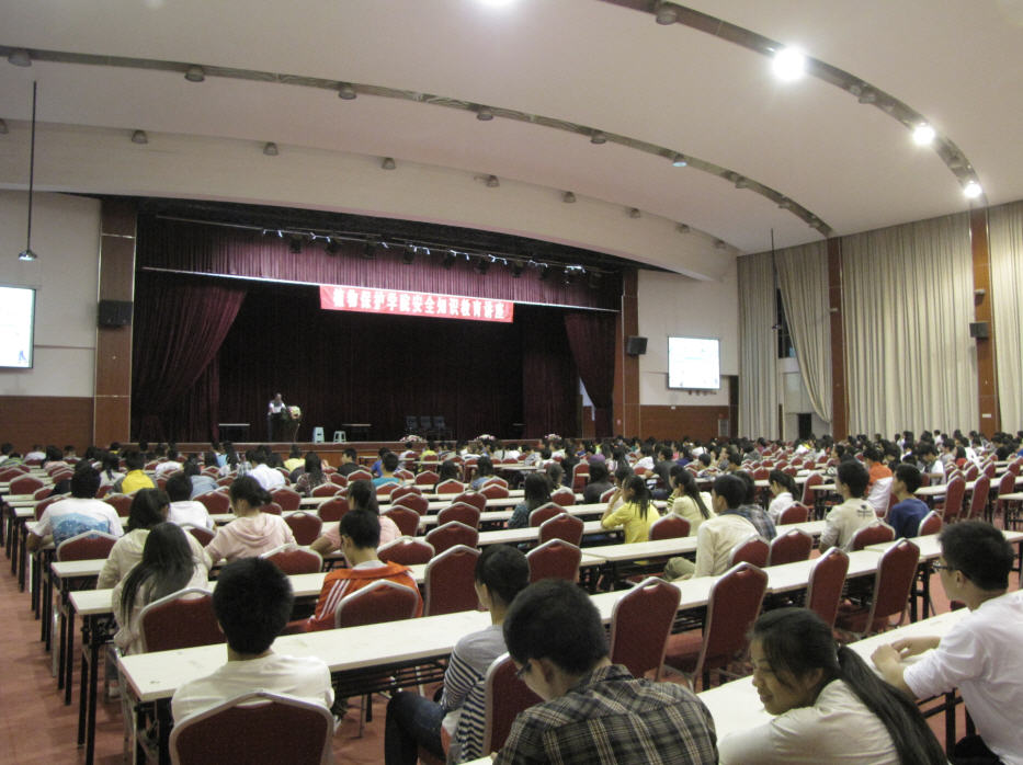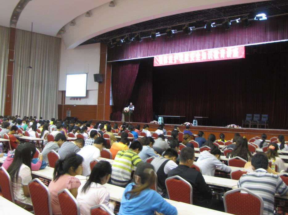 2012年9月10日晚,yl8cc永利邀请保卫处熊雁兵副处长及其安全培训小组志愿者,在学校体育馆副馆为学院2012级本科及研究生新同学举行老员工安全知识教育讲座。讲座由公司党委副书记何霞红教授主持。熊副处长首先邀请部分新同学上场参与一个测试不同情形下的应变反应速度的一个小游戏。之后,在一阵欢笑声中讲座正式开始。