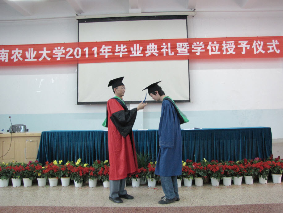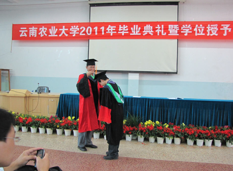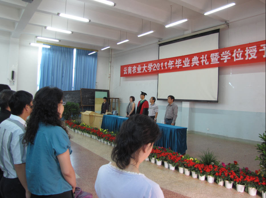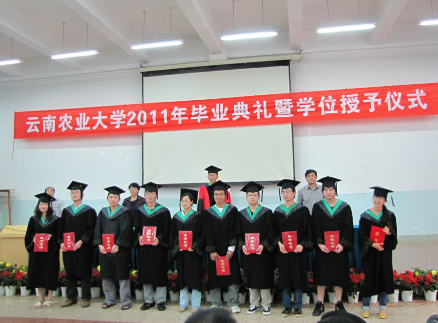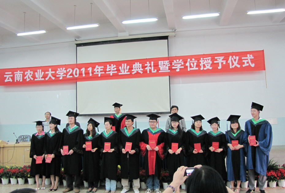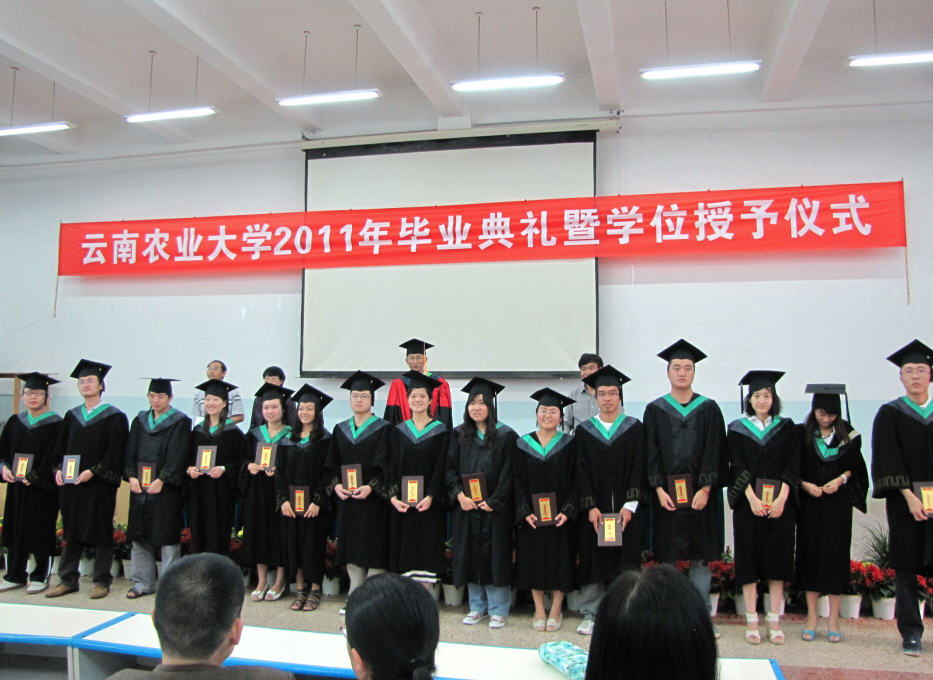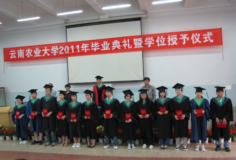 受学校授权,2011年6月22日上午,在四号教学楼阶梯教室yl8cc永利举行2011届应届毕业生毕业典礼及学位授予仪式。仪式由公司党总支陶玫书记主持,yl8cc永利经理李强教授、教育部植物病理重点实验室主任王云月教授、云南省植物病理重点实验室主任叶敏教授、学院副经理陈斌教授一同在主席台就座。学院全体2011届本科、硕士和博士毕业生全部到场,学院各系、教研室和实验教学中心的主要负责人和全体毕业班班主任以及学院团委老师及部分家长也一同出席见证这激动人心的时刻。在庄重的国歌中毕业典礼正式开始。李强经理首先代表学院对全体按期毕业的毕业生表示热烈祝贺,并提出几点殷切的希望。随后王云月教授和陈斌副经理分别介绍了今年研究生和毕业生顺利毕业和学位授予情况。紧接着举行学位授予仪式。在欢快的进行曲中,李强经理为全体按期毕业的博士、硕士和本科毕业生一一上台执拨穗礼,所有上台的毕业生都倍感激动。执拨穗礼学位授予完毕,陈斌副经理宣读了获得2011省级、校级优秀毕业生名单,以及校级和院级优秀毕业论文获得者名单,并分别分批上台,由主席台学院领导颁发相关证书并合影。随后学院教师代表蔡红副教授、在校员工代表王月雅同学、毕业生代表李鹏硕士分别上台发言。最后陶书记为整个典礼和学位授予仪式进行总结,并向全体毕业生提出了祝愿和希望:希望大家以后无论是做科研还是在社会上工作,一定要继续严格要求自己;对即将要面对的新生活,鼓励大家有勇于直面生活艰辛的勇气,乘风破浪,扬帆起航。