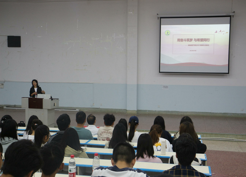 随后,蔡红以“用奋斗筑梦 与希望同行”为题,从学院的历史沿革、学科发展、专业设置、办学特色、团队力量、科研成果及社会服务成效等方面向新生全面详细介绍了学院的情况。
