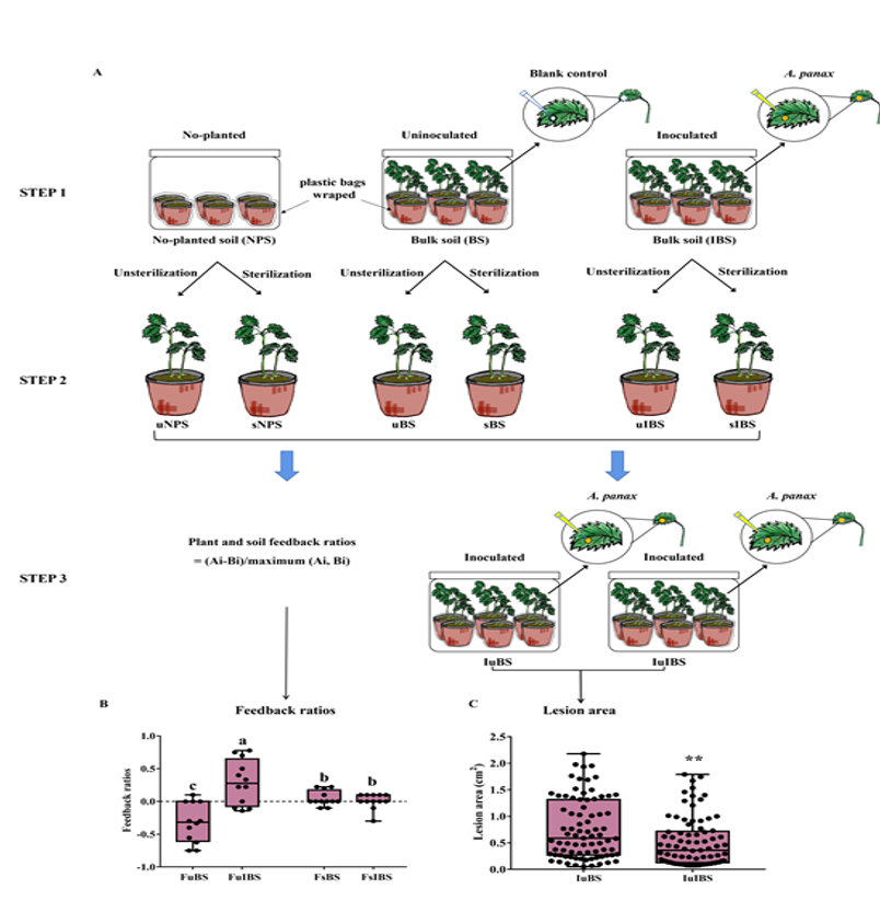 注:A,本实验过程用于评估叶面侵染对植物-土壤反馈和植株抗性的影响。在步骤1中,分别设置未种植处理、种植三七无叶部接种以及种植三七叶部接种病原菌3个处理。在第2步中,将上述三种处理的土壤平均分成两部分。一部分土壤在121°C下灭菌20分钟,另一部分不做处理。然后将这些土壤重新放入花盆中,种植三七种子,并记录种子出苗率。在步骤3中,计算反馈比率,每个重复对的反馈比计算为(Ai-Bi)/maximum(Ai,Bi),其中Ai和Bi表示接种或未接种处理(Ai)以及各自对照(Bi)土壤中的出苗率。另外,在未经灭菌处理的接种和未接种的土壤中,种植三七并叶部挑战接种A. panax,然后测定其病斑面积。B和C,表示反馈比率(B)和病斑面积(C)。FuBS和FsBS分别表示未灭菌或灭菌处理土壤中的反馈比率。FuIBS和FsIBS分别表示叶面侵染后未灭菌或灭菌的土壤中的反馈比率。IuBS和IuIBS分别代表叶部未侵染或侵染土壤中的病斑面积。
