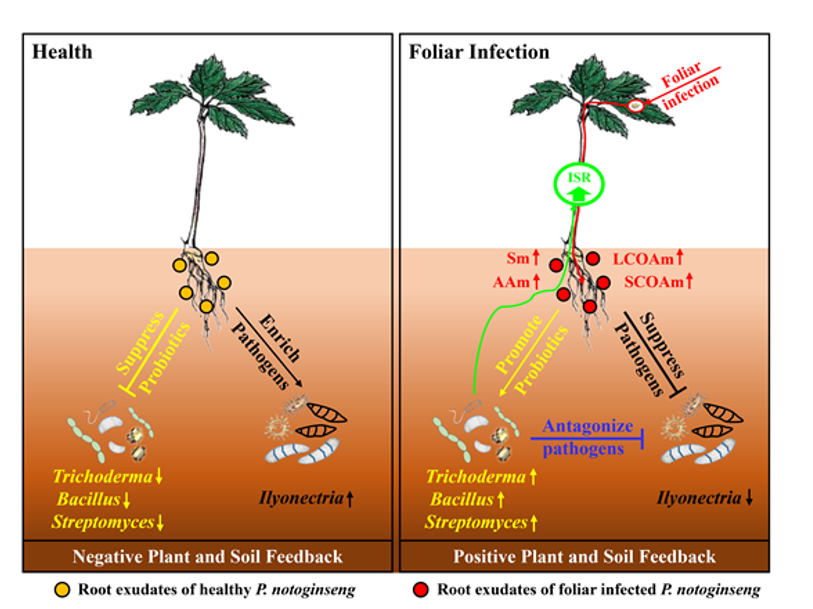 地下土传病害是限制可持续农业生产的主要因素,但是由于土壤环境的错综复杂,很难有效防治植物土传病害。本研究发现三七叶部受病原菌侵染后能促进根系分泌有机酸、糖和氨基酸,不仅能抑制土传病原菌还能募集根际有益微生物来缓解地下土传病害(图7)。本研究表明,通过地上部的适当刺激来调控植物根际微生物群落,实现植物土传病害的防治,是一种新的根部病害防治策略。目前,课题组正在深入解析其中的关键机制,筛选开发了一系列的“叶面处理调控根际微生物”诱导剂,为实现土传病害防控探索新的路径。