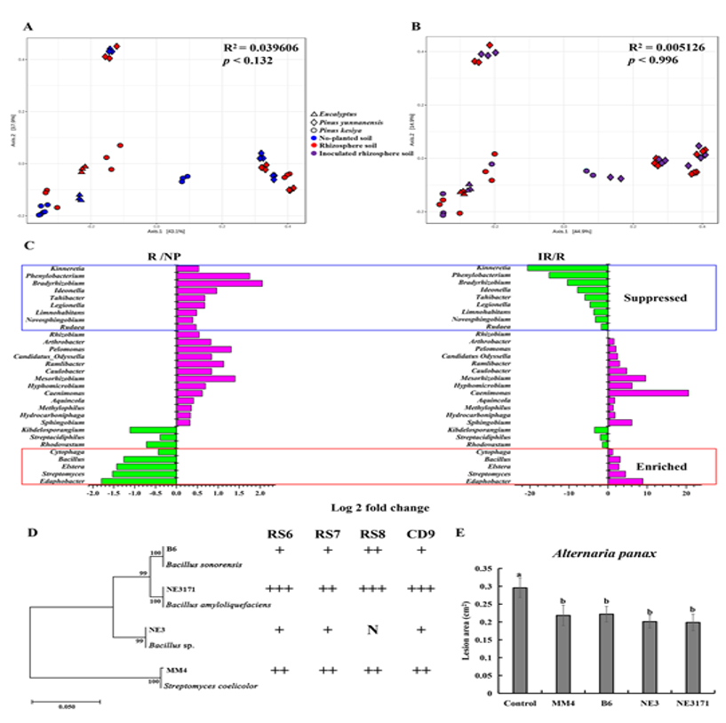 注:A和B,未接种植物根际土壤和未种植土壤(A)或接种植物根际土壤(B)中的细菌群落的PCoA分析。C,在属水平上比较无植物(NP)、未接种(R)和接种根际(IR)土壤中的细菌丰度差异。D,叶部侵染后上调细菌基于16S rDNA序列构建的系统发育树以及对锈腐病原菌(RS6、RS7、RS8和CD9)的拮抗活性测定,N表示拮抗率<0,+表示拮抗率为0~30%,++表示拮抗率30~60%,+++表示拮抗率≥60%。E,叶部接菌后上调细菌回接到三七根际后,叶部接种人参链格孢菌后的病斑面积差异。