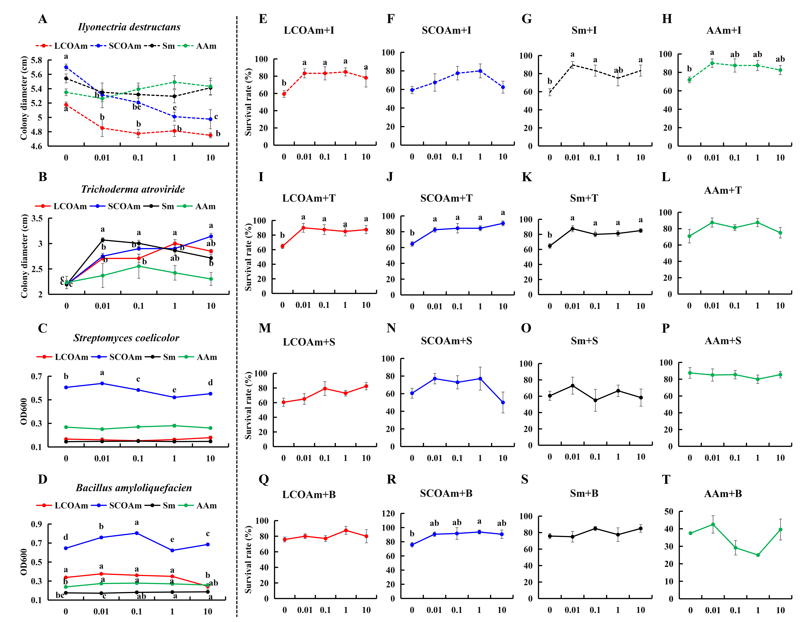amyloliquefaciens(B)与长链有机酸(邻苯二甲酸,棕榈酸和壬二酸)混合物(LCOAm),短链有机酸(戊二酸,甘油酸,dl-β-羟基丁酸,乙醇酸和丙酸)混合物(SCOAm),糖(核糖和d -甘露糖)混合物(Sm)和氨基酸(l -天冬氨酸,丙氨酸,氧脯氨酸和l -丝氨酸)混合物(AAm)对三七存苗率的影响。