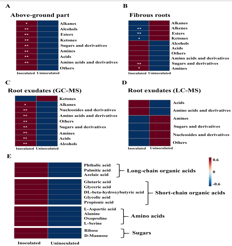 本文随后使用GC-MS和HPLC-MS分析了叶部受侵染后的三七地上部和地下部代谢及根系分泌物的组成,发现叶部病原菌侵染能改变植株代谢,并增加三七根系分泌物中短链和长链有机酸、糖和氨基酸的含量(图4)。