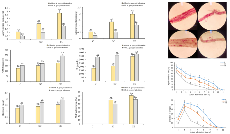 etunicatum,CE)和缩隔球囊霉(Septoglomus constrictum,SC)对紫茎泽兰响应棉蚜取食的影响,发现棉蚜取食抑制了紫茎泽兰的生长,并提高了紫茎泽兰对棉蚜取食的应激性。而接种AMF的紫茎泽兰可通过增加生物量和营养物质含量来提高其耐受性,并通过增加抗氧化酶活性、防御性激素和次生代谢物含量来提高其对昆虫的抗性。C. etunicatum处理对紫茎泽兰根系侵染率显著大于S.