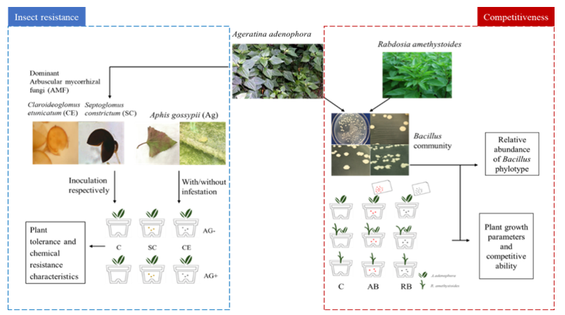 紫茎泽兰是一种世界恶性入侵杂草,其入侵对我国的经济和生态环境造成巨大损失,开展其入侵机理的研究具有重要意义。近期,yl8cc永利桂富荣教授团队在中科院二区TOP期刊Frontiers in Plant Science(IF=6.627)连续发表两篇研究论文,揭示了入侵植物紫茎泽兰根际微生物在其入侵过程中对提高抗虫性、促进蔓延扩张及提升对本地植物的竞争力方面的重要作用。
