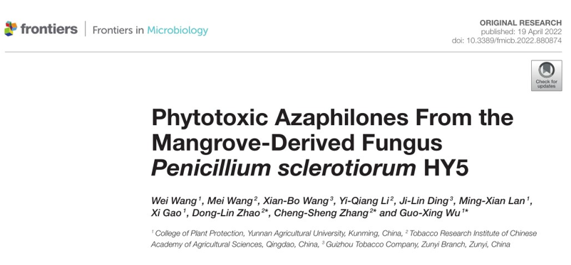 公司2019级博士研究生王伟在导师吴国星教授和中国农业科学院烟草研究所张成省研究员、赵栋霖副研究员指导下,在天然产物除草剂研究方面取得新进展,相关研究成果以“Phytotoxic azaphilones from the mangrove-derived fungus Penicillium sclerotiorum HY5 ”为题在线发表于国际知名微生物学期刊《Frontiers in Microbiology》(IF=5.64 , JCR1区)。