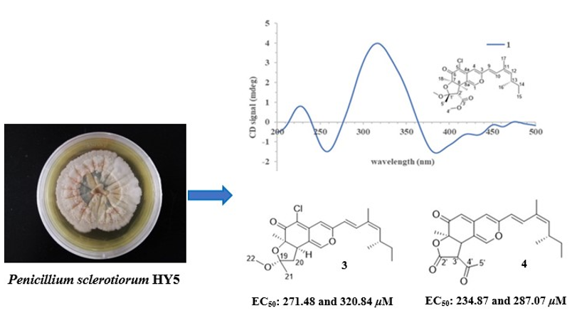 世界各地共发现1800多种对农作物有害的杂草,每年造成全世界粮食减产约34%。当前,对于农田杂草治理,主要依赖于化学除草剂,但其大量使用,导致了环境污染、农药残留、植物药害等一系列问题,亟需研发新型天然产物除草剂。基于此,本研究通过对一株红树林来源青霉菌(Penicillium sclerotiorum)进行批量发酵、柱层析、高效液相色谱以及核磁共振波谱等方法分离鉴定得到7对嗜氮酮(azaphilones)E/Z异构体,其中8个为新化合物。