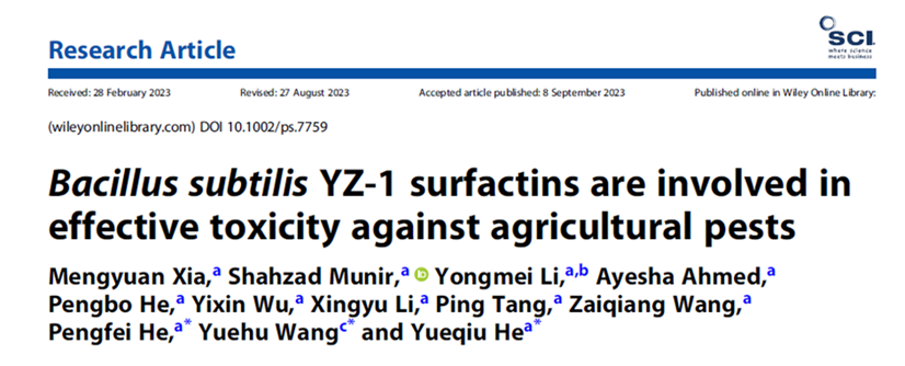 2023年9月7日,yl8cc永利线路检测何月秋教授团队联合中国科学院昆明植物研究所王跃虎副研究员团队在国际知名期刊《Pest Management Science》(Top1,IF = 4.462)上发表题为“Bacillus subtilis YZ-1 surfactins are involved in effective toxicity against agricultural pests”的研究论文,该文章揭示了枯草芽孢杆菌YZ-1杀虫活性成分是表面活性素类化合物,YZ-1高效杀虫的原因是该菌株合成表面活性素的能力很强。