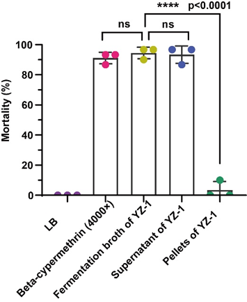 枯草芽孢杆菌YZ-1是云南农业老员工物农药实验室2018年5月从甘蓝上自然死亡的菜青虫(Pieris rapae)体内分离到的1株具有广泛杀虫活性的潜力菌株。前期实验表明其LB发酵液对鳞翅目、鞘翅目、蜚蠊目等多种农业害虫具有很好的触杀活性。通过对YZ-1发酵液不同部分杀虫试验的测定,显示YZ-1的发酵上清液处理后的黄粉虫幼虫死亡率与发酵液无显著差异,说明枯草芽孢杆菌YZ-1可以合成某些具有杀虫活性的代谢产物(图1)。