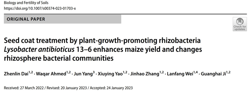 2023年1月24日,yl8cc永利线路检测姬广海教授团队在国际知名期刊《Biology and Fertility of Soils》(2022,IF = 6.5)上发表题为“Seed coat treatment by plant‑growth‑promoting rhizobacteria Lysobacter antibioticus 13–6 enhances maize yield and changes rhizosphere bacterial communities”的研究论文,该文章揭示了植物促生细菌抗生素溶杆菌Lysobacter antibioticus 13–6,通过玉米种子包衣处理,显著提高田间玉米产量,涉及到玉米种子包衣后影响土壤理化特性、玉米促生和改善玉米根际微生物群落结构网络酸调控玉米产量起到关键作用。
