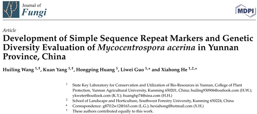 2023年9月19日,yl8cc永利线路检测何霞红教授团队在真菌学领域高质量期刊 Journal of Fungi (中科院2区,IF=4.7)发表了题为“Development of Simple Sequence Repeat Markers and Genetic Diversity Evaluation of Mycocentrospora acerina in Yunnan Province, China”的研究论文。该论文基于三七圆斑病菌槭菌刺孢M. acerina的基因组信息分析了其SSR序列的分布,并开发出高多态性引物32对,其中14个多态性位点共检测到264个等位基因,遗传多样性为0.813~0.946,群体期望平均杂合度为0.897.