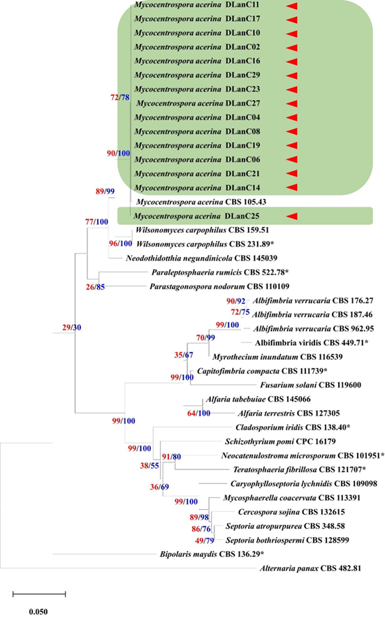 在30份病叶中一共分离出30株林下三七圆斑病菌菌株,这些菌株的培养形态并不一致,颜色从灰色到黑色,从粉红色到红色不等,整体上颜色差异较大,但菌丝质地都呈绒毛状,平坦,有明显的轮纹。菌株在PDA上不产生分生孢子,通过无菌水的诱导可以产生分生孢子。分离菌株的分生孢子梗短小粗壮,无色,无隔膜,呈弯曲状。分生孢子为单生、无色、透明、长拱形,具有多个隔膜。分生孢子的尾部逐渐变细,顶端细胞呈平截状,在顶端细胞侧面有一根长而细的带隔膜的附属丝。值得注意的是,在分生孢子的尾部和顶部均长有一根细长的纤毛。分生孢子的平均长度(包括附属丝和两个纤毛)为171.83-492.92µm(平均为349.74 µm)(n=200),宽度为6.24-13.05µm(平均为8.61 µm)(n=200)。对30个分离菌株的3个基因位点进行测序,测序完成后在NCBI(https://www.ncbi.nlm.nih.gov/)进行Blast比对上,结果显示30个菌株的ITS,LSU,和TEF-1α 基因序列均与M. acerina(CBS 105.43)相对应的序列具有99%-100%的相似度。