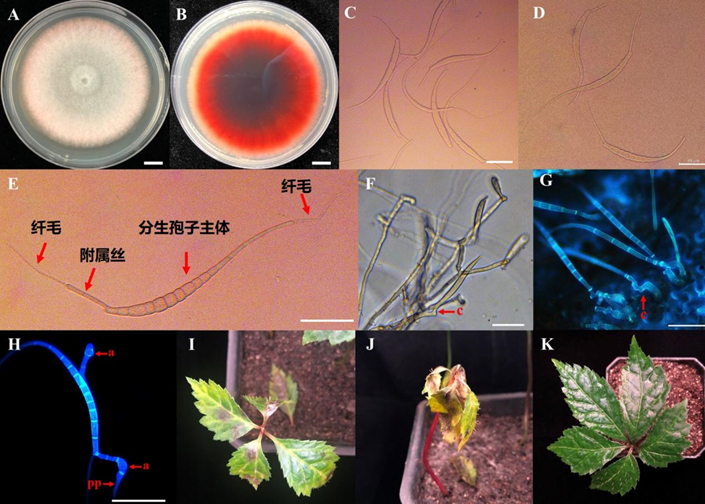 图2 林下三七圆斑病菌的菌落、分生孢子梗和分生孢子的形态特征