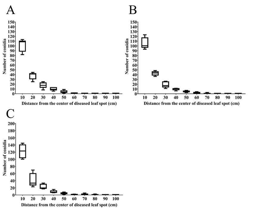2020年8月至10月,在田间测定了槭菌刺孢分生孢子的传播和侵染距离。第一次试验于8月25日开始,经过半个月的时间(期间有降雨),在9月9日测量了距离接种源不同距离处的三七圆斑病发病率。在距离接种源1 m处的三七圆斑病发病率为13.33%,当距离大于1m时,未发现有三七圆斑病发生。第二次试验于9月10日至9月25日进行,试验结果表明在接种源附近的所有健康三七植株均被侵染(距离0 m),发病率为100%,距离接种源1 m处的平均发病率为39.67%,和第一次的试验结果类似,在距离接种源超过1m的地方没有发现三七圆斑病植株。第三次实验于9月26日至10月11日进行,结果与第一次和第二次的试验结果相似,发病的三七植株均在距离接种源1 m之内,和接种源的距离超过1m时的三七均未发病。