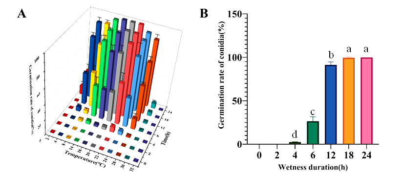 图4 温度和叶面水膜持续时间对分生孢子萌发的影响