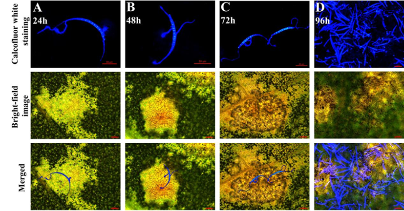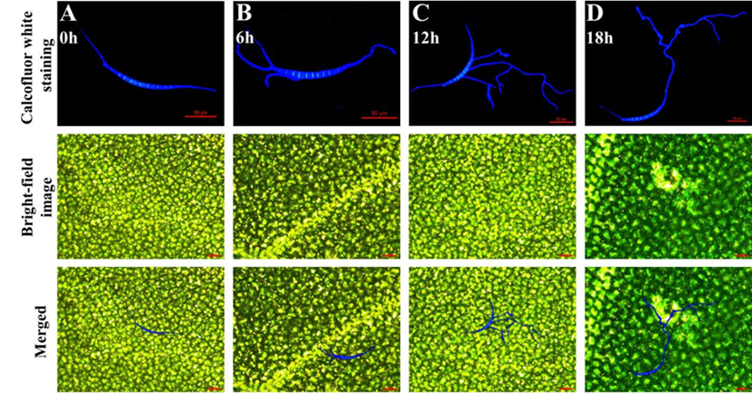 为了可以同时观察到三七叶片表面槭菌刺孢分生孢子的生长发育和三七叶片表面的变化,我们分别使用荧光显微镜的紫外光和正常光对三七叶片的同一个位置进行拍照。在6 hpi,多个初生菌丝从分生孢子不同位置的细胞中萌发长出。在6 hpi和12 hpi之间,初生菌丝继续伸长,一些菌丝末端膨大形成附着胞。在18 hpi,叶表面出现轻微损伤,表明菌丝已经侵入到三七叶片内部。到24 hpi,病斑区域继续扩大,病斑更加明显,且在病斑中心可以看到一个非常明显的分生孢子附着胞,并且病斑的扩展以附着胞为中心向四周蔓延。到48 hpi,病变中心从浅黄色变为橙黄色,橙黄色的病斑中心也有一个附着胞在中间。在72 hpi,病斑进一步扩大,病斑中心颜色越来越深,并从橙黄色变为棕色。在96 hpi,可以看到从病斑表面长出许多个分生孢子。三七病斑表面的分生孢子是由病斑内部膨大的菌丝产生的,槭菌刺孢分生孢子从接种到发病,再到病斑上长出新的分生孢子,可以在四天内完成。