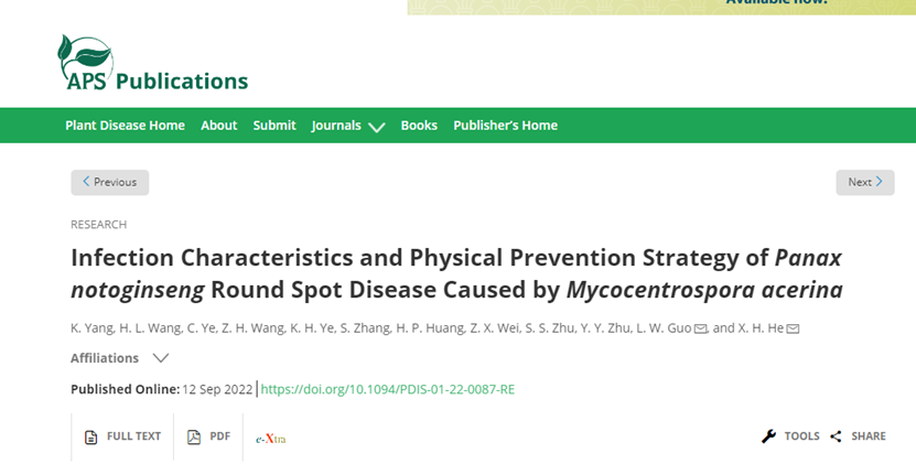2022年9月12日,农林科学1区Top期刊PLANT DISEASE(IF=4.614)上在线发表了yl8cc永利线路检测何霞红教授团队题为 “Infection Characteristics and Physical Prevention Strategy of Panax notoginseng Round Spot Disease Caused by Mycocentrospora acerina” 的研究论文。该论文揭示了林下三七圆斑病病原菌的侵染过程并验证了避雨栽培对三七圆斑病的控制效果。