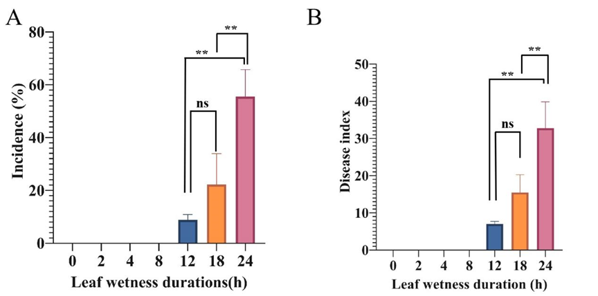 为了评估叶面水膜持续时间对分生孢子侵染三七的影响,用人工喷洒分生孢子悬浮液的方法,在室内模拟了在不同叶面水膜持续时间下三七圆斑病的发病率,在接种后的第10天开始调查三七圆斑病的发生率。当叶面水膜持续时间小于或等于8h时,三七没有发病,当叶面水膜持续时间大于或等于12小时时,三七圆斑病的发病率和病情指数随着叶面水膜持续时间的增加而增加,当叶面水膜持续时间24h时,三七圆斑病的发病率和病情指数分别为55.56%和32.78,显著高于12h和18h的发病率和病情指数。