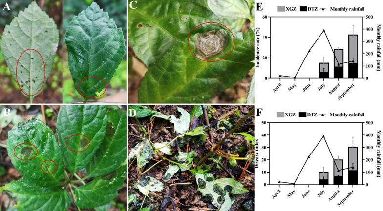 林下三七圆斑病是林下三七种植过程中的主要叶部病害并且具有明显的发病特点。每年的林下三七圆斑病都是伴随着雨季的来临而发生,发病初期在三七叶片上出现圆形或近圆形的水渍状小病斑,病斑中心具有一个明显的棕色斑点,随后病斑逐渐扩大,颜色逐渐加深变为棕色或灰褐色,并有明显的“轮纹”,在发病中后期,病斑的表面会出现白色粉末状物质,这是三七圆斑病菌的分生孢子堆,到发病后期,多个病斑合并,导致叶片腐烂和凋落。三七圆斑病发病会形成明显的发病中心,然后从发病中心向四周传播蔓延。