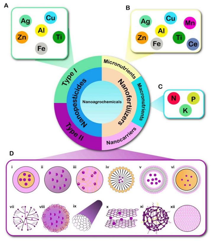 纳米杀虫剂包括两类,I类是金属基(A),而II型(D)是由聚合物、粘土和玉米醇溶蛋白颗粒构成的纳米载体,包括纳米胶囊(i)、纳米球(ii )、纳米凝胶(iii)、纳米凝胶、纳米脂质体(v)、固体脂质NPs(vi)、树枝状分子(vii)、玉米醇溶蛋白NPs(viii)、碳纳米管(ix)、石墨烯NMs (x)、纳米复合材料(xi)、介孔二氧化硅NMs(xii)。而纳米肥料可分为三类:纳米宏量营养素(B)、纳米微量营养素(C)和纳米载体(D),它们封装活性成分以实现控制、靶向和同步释放。