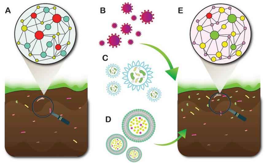 土壤微生物在植物的生长和恢复力中起着关键作用。微生物网络显示了植物的致病性(红色圆圈)及其与土壤(A)中其他微生物的相互作用。然而,这些相互作用可以通过应用定制的MNOs (B)、纳米封装的PGPB (C)或纳米封装的微生物代谢物或生物化合物(D)来调节,这些代谢物或生物化合物有助于招募有益的微生物(绿色圆圈)并丰富功能分类群(黄色和粉红色圆圈)(E)。(图5)