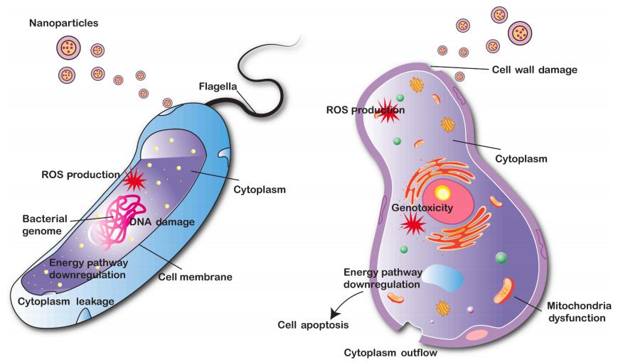 土壤微生物群对生态系统的最佳功能调控非常重要而细菌和真菌是土壤微生物群的主要组成成分。MNOs或纳米颗粒破坏细胞壁并渗透到能产生活性氧(ROS)的细胞内部并破坏细胞成分。活性氧破坏能量通路并降低线粒体功能(真菌中)。此外,氧化应激导致遗传毒性,最终导致细胞凋亡。(图4)