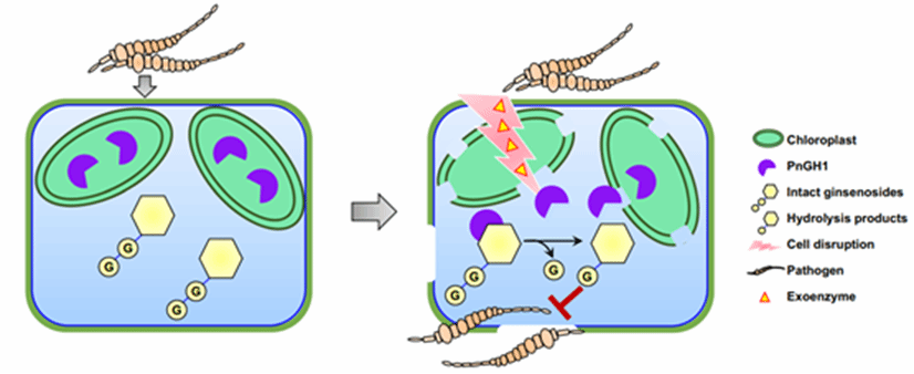 Fig.1 Schematic illustration representing PnGH1-mediated ginsenoside hydrolysis in P. notoginseng leaves and its role in chemical defence against pathogenic phytopathogens. P. notoginseng has evolved a two-component defence system comprising the β-glucosidase PnGH1 and PPD-type ginsenosides. Chloroplast-localized PnGH1 is released and mixed with its substrates upon cell disruption, potentially mediated by the induced exoenzymes of pathogenic fungi. Subsequently, PnGH1-mediated hydrolysis produces a series of less-polar ginsenosides with more potent antifungal activity.