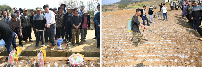 培训开始前,朱有勇院士从我们“为什么来”“来做什么”“怎么做”三个角度介绍了此次培训的目的;团队李娟博士、汤东生副教授、杜广祖副教授和郭力维副教授分别从水稻旱作种植、除草、防虫、控病四个方面进行专题授课。本次培训共发放“水稻旱作种植技术手册”138份。培训结束后,朱有勇院士与各级领导班子进行座谈交流,针对水稻旱作土地、种子和除草剂、播种机等筹备工作开展详实研讨,进一步保障2023年开远中和营镇4600亩、苟街村350亩水稻旱作工作顺利开展。最后,朱有勇院士及其团队到田间地头开展实操培训,手把手教卡房镇苟街村农户进行种子拌种、小型机械直播、喷洒封草药剂等农事操作,朱有勇院士说到:“我们这个种植技术简单,不用器械,只用点力,老人推着就可以把种子种下去,一人每天可以种4~5亩”。当地农户纷纷表示,感谢朱有勇院士带着水稻旱作的科技成果来到这里,有了院士和团队专家的帮助和支持,大家有信心做好水稻旱作工作,吃上自己种的优质大米。