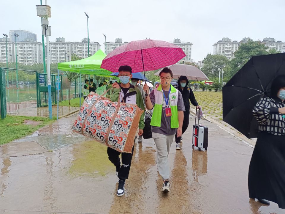 在学长学姐的帮助下,新生们顺利地进入校园,被一路引导着来到报到点,由班主任或辅导员核查相关入学材料后,领取入学指南和住宿卡,再乘坐摆渡车到达宿舍。一路上,志愿者们或抢着接过行李,或引导新生排队报到,或将新生送至乘车点,遇到楼层高、行李多的新同学,志愿者们二话不说,扛起行李就冲上楼去……直至深夜22时,志愿者们仍然驻守在校门口,直到双腿再也支撑不住,直到一切变得寂静,才拖着疲惫的身躯离开属于他们的战场。
