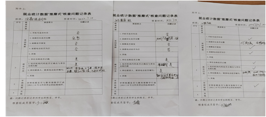 核查结果显示毕业去向落实统计工作整体较好,数据采集规范、审核依据充分。具体表现为:手机号码正确、邮箱正确、3位同学家庭地址未填写到村/乡镇/小区,1位同学单位名称填写错误、11位同学单位联系人和联系电话填写不规范、4位同学单位地址有误。以上有误信息均已通知员工修改。