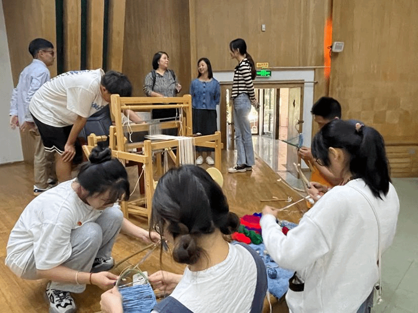 随后,现场开展了大理扎染手工编织技法体验活动,通过使用树枝、木条等固定出大致形状,再自由选择喜欢的扎染布料进行编织。现场还设有手工织布体验区。在体验过程中,大家深切感受了扎染编织经纬之间的温度,对扎染文化有了新的认识,也了解了传统织布机的工作原理,认识到每一匹精致的布料背后,是无数匠人日日夜夜“一踩一推一拉”的劳动和智慧结晶。